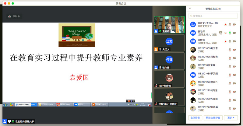 为进一步加强对2018级学生的实习指导,提高学生的实习质量,9月9日下午,特殊教育学院举办实习指导线上讲座。此次讲座的主题是《在教育实习过程中提升教师专业素养》,主讲人为江苏省特级教师、正高级教师、江苏第二师范学院袁爱国教授。讲座由学院副院长张伟锋主持,2018级全体实习生参加。
