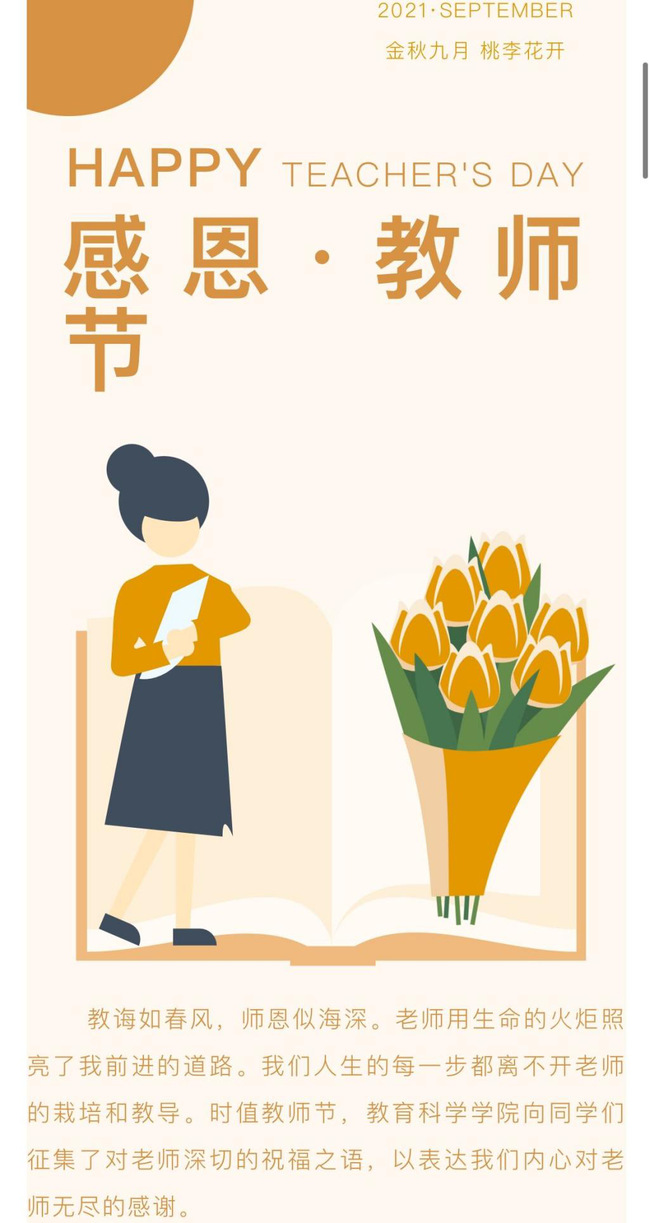 师恩如山,因为高山巍巍,使人崇敬;师恩如海,因为大海浩瀚,无法估量。为了庆祝第37个教师节的到来,教育科学学院于9月10日举办了教师节“大声说出爱”活动,该院学子纷纷在线上留言,向教师献上了最诚挚的祝福。