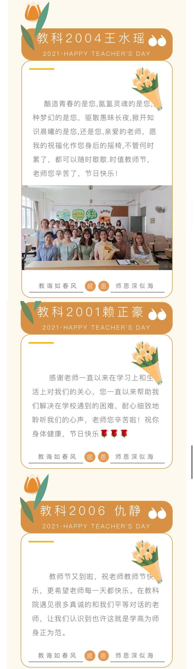 此次教师节活动,我们感受到了浓浓的师生情谊和教育事业的传承力量。教育科学学院全体学子祝各位老师教师节快乐!(文/李维翔 张晨洁 张杨悦)