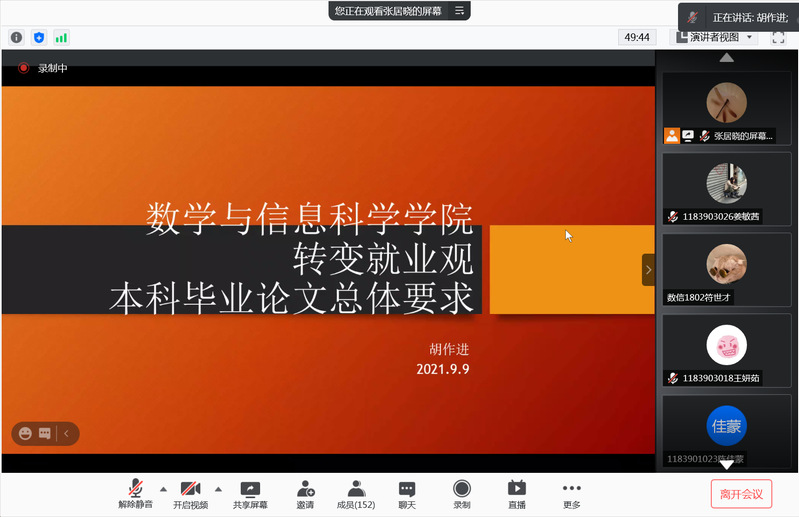 9月8日,数学与信息科学学院面向2018级全体毕业生开展了以“转变就业观及本科毕业论文总体要求”为主题的讲座。本次讲座由数学与信息科学学院院长胡作进主讲。