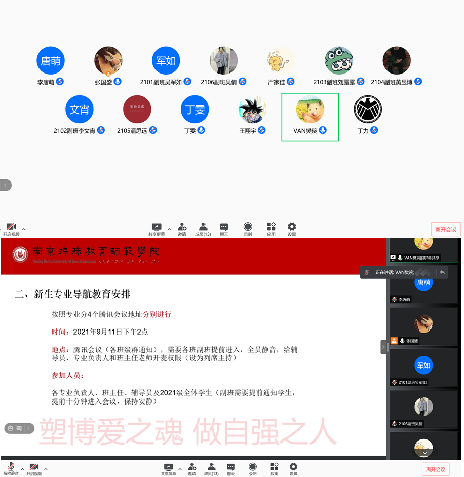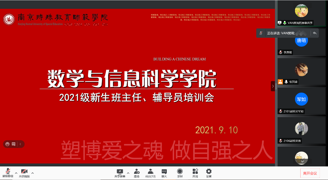 为做好2021级新生专业导航教育,明确班主任、辅导员的职责,提高新生线上教学工作水平,9月10日晚,数学与信息科学学院召开了2021级新生班主任、辅导员培训会。培训会由辅导员樊琬主持,党总支副书记丁雯,2021级辅导员、班主任和副班参与此次培训会。