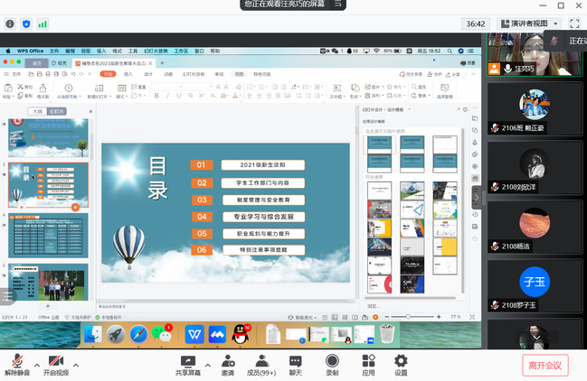 会上,汪亮巧老师播放教科院教师和学长学姐的寄语视频,向全体2021级新生表示热烈欢迎。两位老师分别从新生入学须知、学生工作部门与内容、制度管理、专业学习、职业规划等五方面详细介绍学院情况,为新生未来四年的学习、生活提供了指导和建议。会议最后,汪亮巧老师就新生线下报到事项做具体说明,提醒新生们严格遵守线上教学管理规定,养成良好学习习惯;要求所有同学居家线上学习,严格遵守防疫要求;通过案例分析提高学生安全意识,谨防上当受骗。