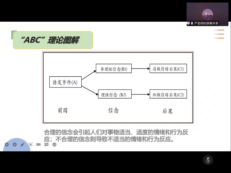 讲座伊始,严茹老师指出今天的讲座将从认识情绪、觉知情绪、接纳情绪、管理情绪这四个方面展开讲解如何提升情绪管理能力。严茹老师通过一个小游戏引出今天的话题,告诉同学们行为反应会影响一个人的情绪,能够管理好自己的情绪是一个很重要的本领。严老师通过播放视频、辨别微表情、表情判断等方式教同学们学会从日常生活中的细节出发去剖析情绪所带来的各种影响。一个人要懂得觉知自己的情绪,并敏锐觉知他人的情绪,才能够及时调节自己与他人的情绪。严老师通过“情绪有无好坏之分”这一问题来引出最后一个版块的内容——管理情绪。一个人如果能够管理好你的情绪那么就能够控制好你的人生,在很多方面给予你帮助,严老师以分析图片的方式告诉同学们不同的聚焦会带来不同的结果,同一件事,不同的人认知不同最后导致不同的情绪。美国心理学家埃利斯说过“情绪不是由某一诱发性事件本身所引起的,而是由经历了这一事件的个体对这一事件的解释和评价所引起的”。通过“ABC”理论图解,让同学们知晓了合理的信念会引起人们对事物适当、适度的情绪和行为反应,不合理的信念则会导致不适当的情绪和行为反应。