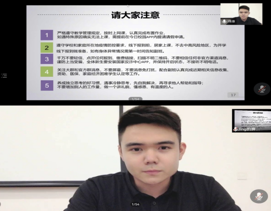 学工办负责人邸鹏老师向2021级新生详细地介绍了奖助学金体系与评比方法,进一步让新生同学明晰了学校的奖助制度与具体细则。同时,对新生提出勉励与期望,激励新生勤勉学习、携手共进、共同成长,用青春活力与创造力为学院发展助力。新生辅导员李欣璟老师详细介绍了新生分班情况、学生工作相关部门、辅导员与班主任工作职责、请销假制度、宿舍卫生和安全制度等,使新生多角度、深层次地了解我校相关情况。新生辅导员傅康老师倡导全体新生要树立“三个意识”、培养“两种能力”。配合疫情防控的大局意识、线上教学安排的纪律意识与互联网社交的思辨意识;着重培养多角度看问题的能力与独立自主解决问题的能力。最后,两位辅导员老师就新生关于入学方面的疑问一一解答。