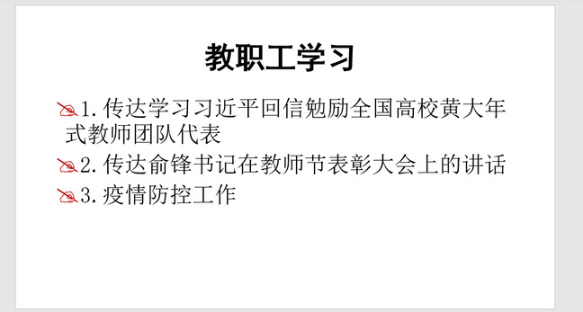 教师节前夕,习近平总书记给全国高校黄大年式教师团队代表回信,肯定了黄大年式教师团队取得的成绩,对全国高校广大教师提出了殷切希望。教育科学学院党总支第一时间组织专题政治理论学习,并向全体教职工传达回信精神,提出学习要求,在全院掀起了学习习近平总书记给全国高校黄大年式教师团队代表重要回信精神的热潮。