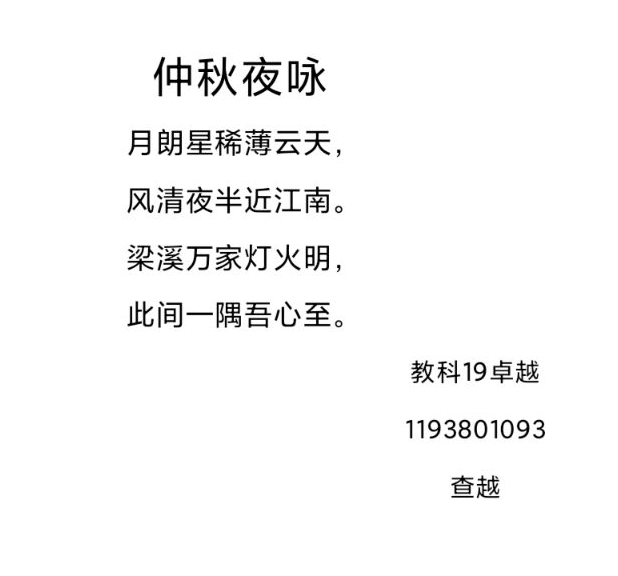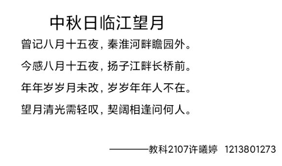 为引导同学们进一步了解传统文化,阅读经典诗篇,感受历史温度,从而更好进行传承与发扬传统文化,教育科学学院于9月17日-9月21日举办“家和月圆 经典永传”中秋诗文比赛。该院全体学生积极参加。