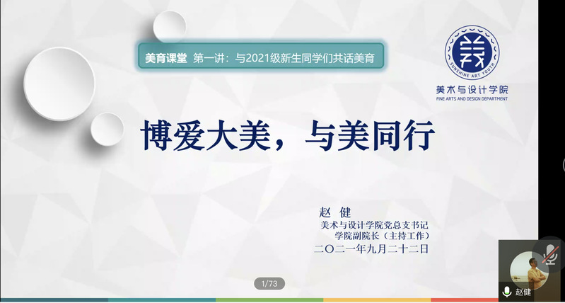 为进一步加强美育工作,以美育德、以美启智、以美健体、以美促劳,9月22日晚上,美术与设计学院党总支书记、副院长(主持工作)赵健为2021级全体新生开展“博爱大美,与美同行”美育课堂第一讲,讲座由美术与设计学院团总支副书记朱思思主持,全体辅导员及2021级全体新生参加本次讲座。