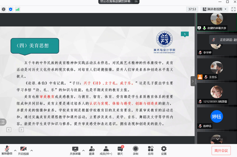 赵健书记从校史校情、院史院情的介绍展开讲座,着重讲解了“美育思想”及我校、我院“美育成果”,并从美育的内涵、历史传统、中华美育精神、时代精神等多方面、多维度阐述了美育的价值与意义。赵健书记指出,美术学院高度重视美育教育,始终围绕立德树人的根本任务,努力探索美育融入课堂教育教学,希望同学们在“博爱大美”的道路上越走越远,与美同行,向美而生。