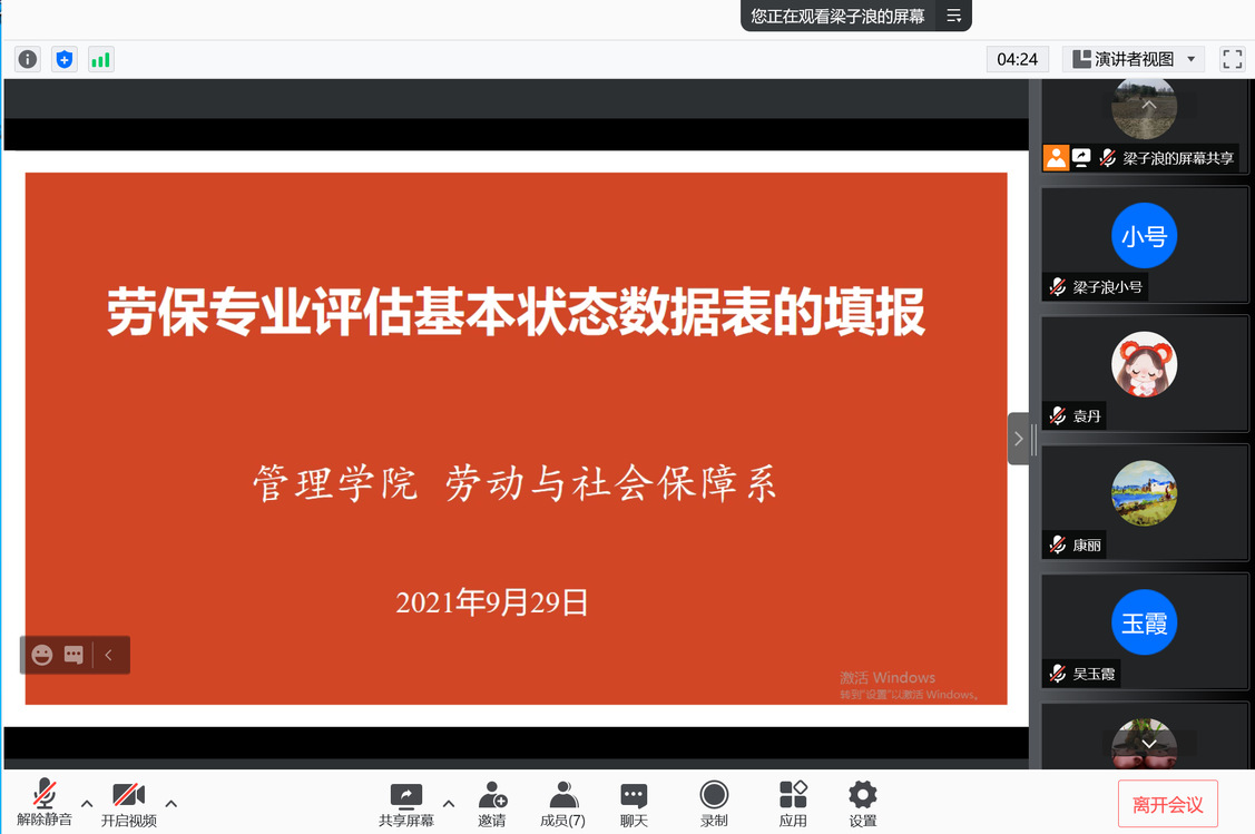 9月29日下午,劳动与社会保障系在线召开了专业评估研讨交流会。会议由副院长康丽主持,专业负责人吴玉霞教授、系主任梁子浪以及社保系专任教师梅晓红、徐梦、杨烨、袁丹等参加了会议。