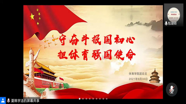 今年是建国七十二周年。为了加强大学生爱国主义教育,培养体育学子体育担当责任,年9月30日晚8点,体育学院于线上开展以“守奋斗报国初心,担体育强国使命”为主题的团日活动。参与本次活动的有体育学院团总支负责人赵伟健,体育学院辅导员屈文文,以及体育学院全体学生。