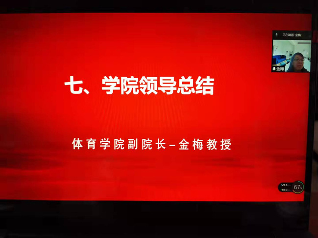 会议最后一项,体育学院副院长金梅作总结发言。她指出2017年成立的体育学院是全校最年轻而充满活力的学院,2021级新生是我院的第三届本科生。体育学院将竭尽所能为大家提供更好的学习训练环境,帮助学生成长,见证大家的青葱岁月。她希望每位新生涵养性情、陶冶情操、提升人生品味;用心感受科学之美,崇尚真理,深入体育科学殿堂,求得真学问、练就真本领;锻炼强健体魄,为祖国体育事业发展奋斗不止,做有担当、敢担当、能担当的体育人。