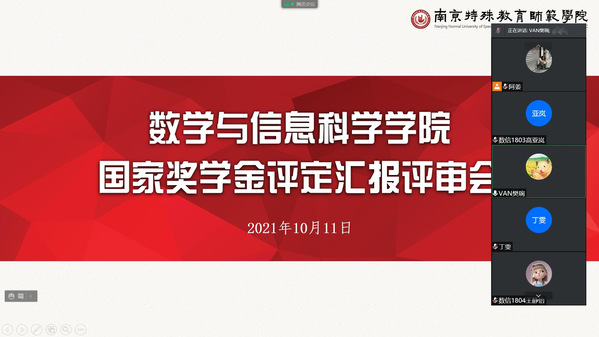 10月11日,数学与信息科学学院于线上开展2020-2021学年国家奖学金评定汇报评审会议。本次评审会由该院辅导员樊琬老师主持,学院党总支副书记丁雯和全体辅导员组成奖学金评审小组参与了会议。