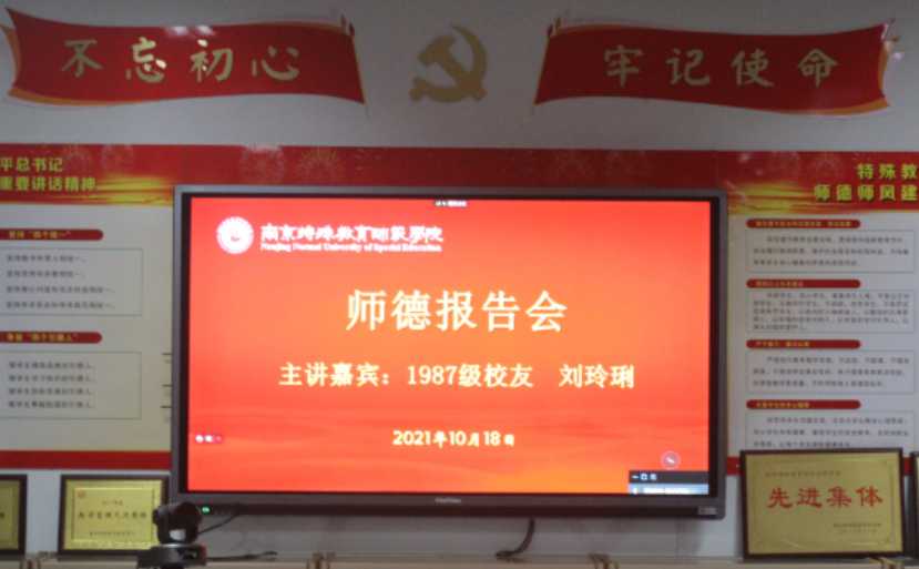 为进一步加强师德师风建设,厚植师范生的特教情怀,特殊教育学院于10月18日下午举办师德报告会,特邀全国三八红旗手和全国优秀共产党员光荣称号获得者、我校1987级校友、湖南省衡阳市特殊教育学校刘玲琍老师作师德报告。特殊教育学院师生代表在2401会议室、2021级新生和2020级学生计400余人参加线上会议,报告会由学院党总支书记叶亮老师主持。