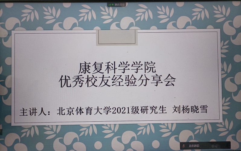10月17日晚,康复科学学院举办优秀校友经验分享会。康复科学学院优秀校友、2017级康复治疗学专业刘杨晓雪与2021级全体新生相聚“云端”,分享学习生活心得。学院团总支书记(学工办主任)负责人主持本次分享会。
