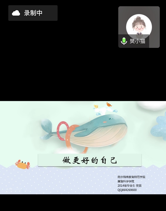 10月27日,康复科学学院“两在两同建新功”系列活动之“优秀校友讲座”在线上顺利举行。讲座邀请到了2014级康复治疗学专业毕业生,现任长沙市特殊教育学校教师樊苗为同学们做了主题为“做最好的自己”的专题讲座。