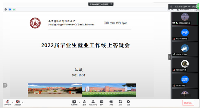 为了让毕业生尽早熟悉就业工作进度安排,教育科学学院于2021年10月31日召开2022届毕业生就业工作线上答疑会议。本次答疑会由该院辅导员江敏老师主讲,2022届全体毕业生参与本次会议。