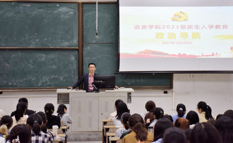10月28日晚,语言学院抓住关键时间节点,在恢复线下教学的第一周开展新生政治导航教育,引领2021级青年学生听党话、跟党走。政治导航教育由学院党总支副书记谢军主讲,2021级新生班辅导员翟玉杨,新入职辅导员何江岳、杨菊鑫以及全体2021级新生参加聆听。
