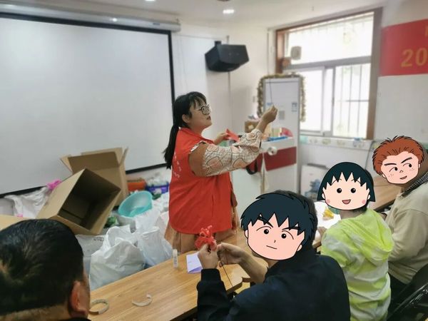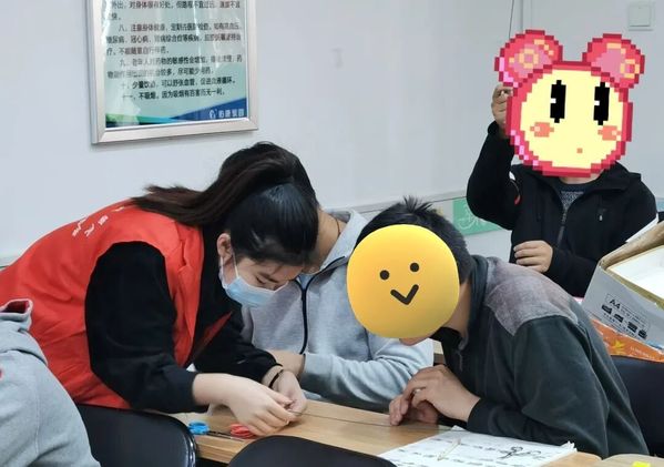 今天志愿者们要和成员们一起制作的手工作品是纸花。活动开始前成员们都坐在座位上,等待着志愿者们发放制作纸花的工具。志愿者们给成员们发完卡纸、剪刀以及其他用具之后就开始了制作活动。制作的过程中,成员们兴趣盎然,志愿者们耐心讲解。制作完成之后,成员们一起摇动着做好的五颜六色的纸花,脸上洋溢着开心的笑容。