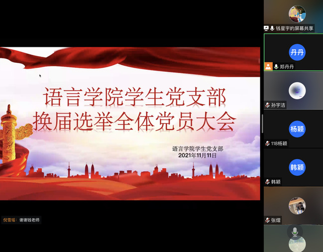 为了切实加强基层党组织建设,更好地发挥党组织的作用,经学院党总支批复同意,语言学院学生党支部于11月11日晚,组织召开支部换届选举大会。会议由上届党支部组织委员钱星宇同志主持,支部党员应到正式党员14人,实到13人,符合召开党员大会相关党内法规规定。