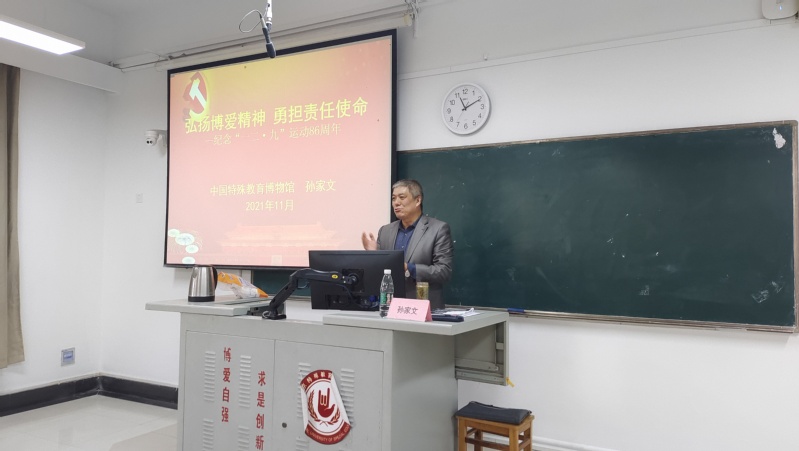 孙老师对“博爱”一词作出了自己的理解与阐释。号召大家,作为新时代青年大学生,要怀揣博爱精神,勇于承担时代赋予的责任。接下来,孙老师简要介绍了“一二·九”运动的起因、发展过程及其在历史上的深远意义。同学们深刻认识到,此次北平学生的爱国运动继承和发扬了五四以来优良传统,有力地昭示了中国青年运动应当坚持的正确方向;促进了中华民族的新觉醒,标志着全国抗日救亡运动新高潮的到来。孙老师还给同学们分享了优秀青年的先进事迹,从有志青年在爱国运动中的冲锋在前,再到当今洪战辉赚钱养家和求学等事迹。同学们通学习先进事迹,再次感受到当代青年应有的面貌,纷纷表示今后要以优秀青年为榜样,发扬他们的勇于担当精神。最后,孙老师特别讲述了荣获10项国家级荣誉称号的我校校友李祥军的优秀事迹,启发同学们以他作为榜样,勇担大任,砥砺前行,为我国的特殊教育事业贡献自己的力量。