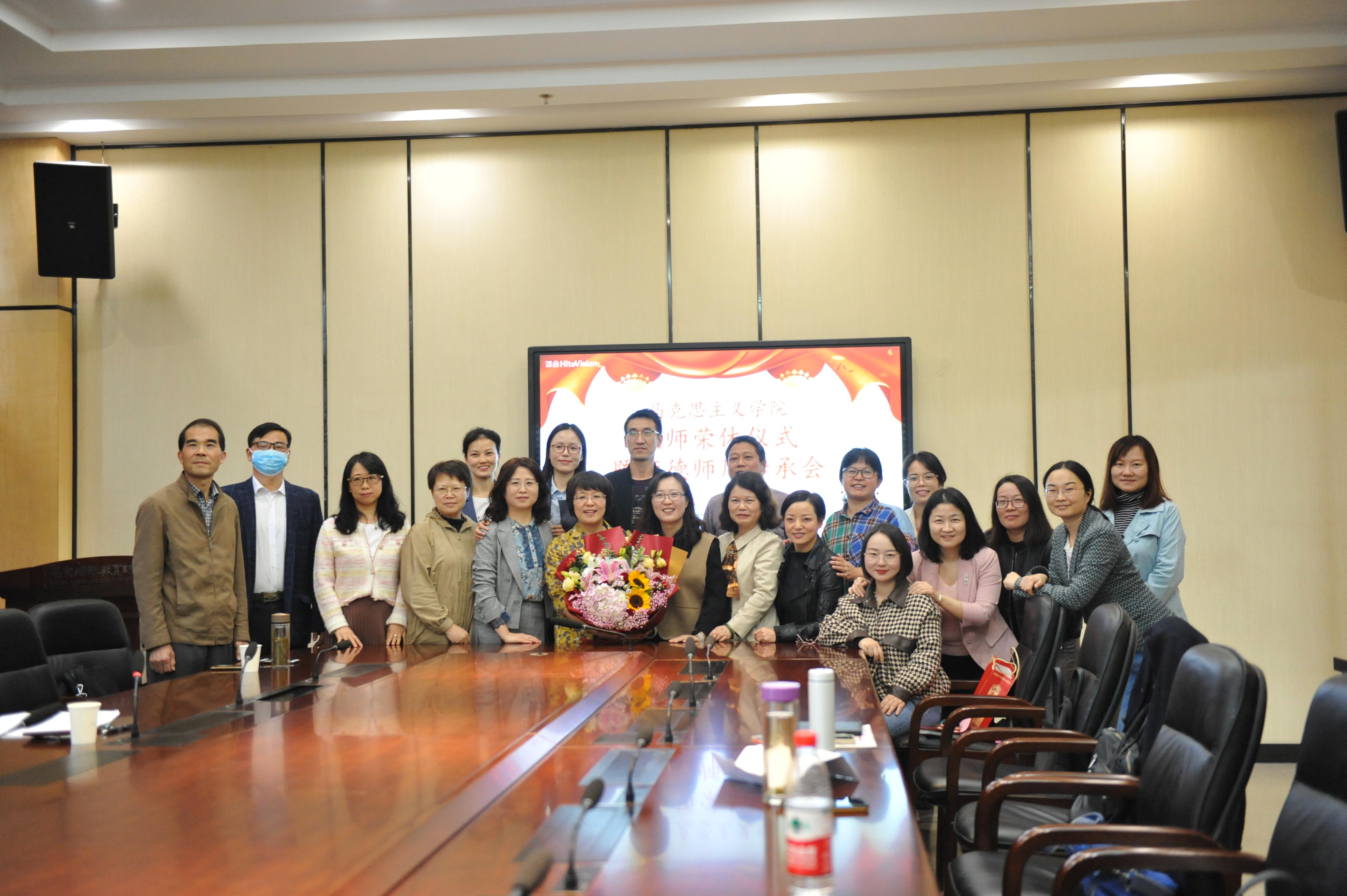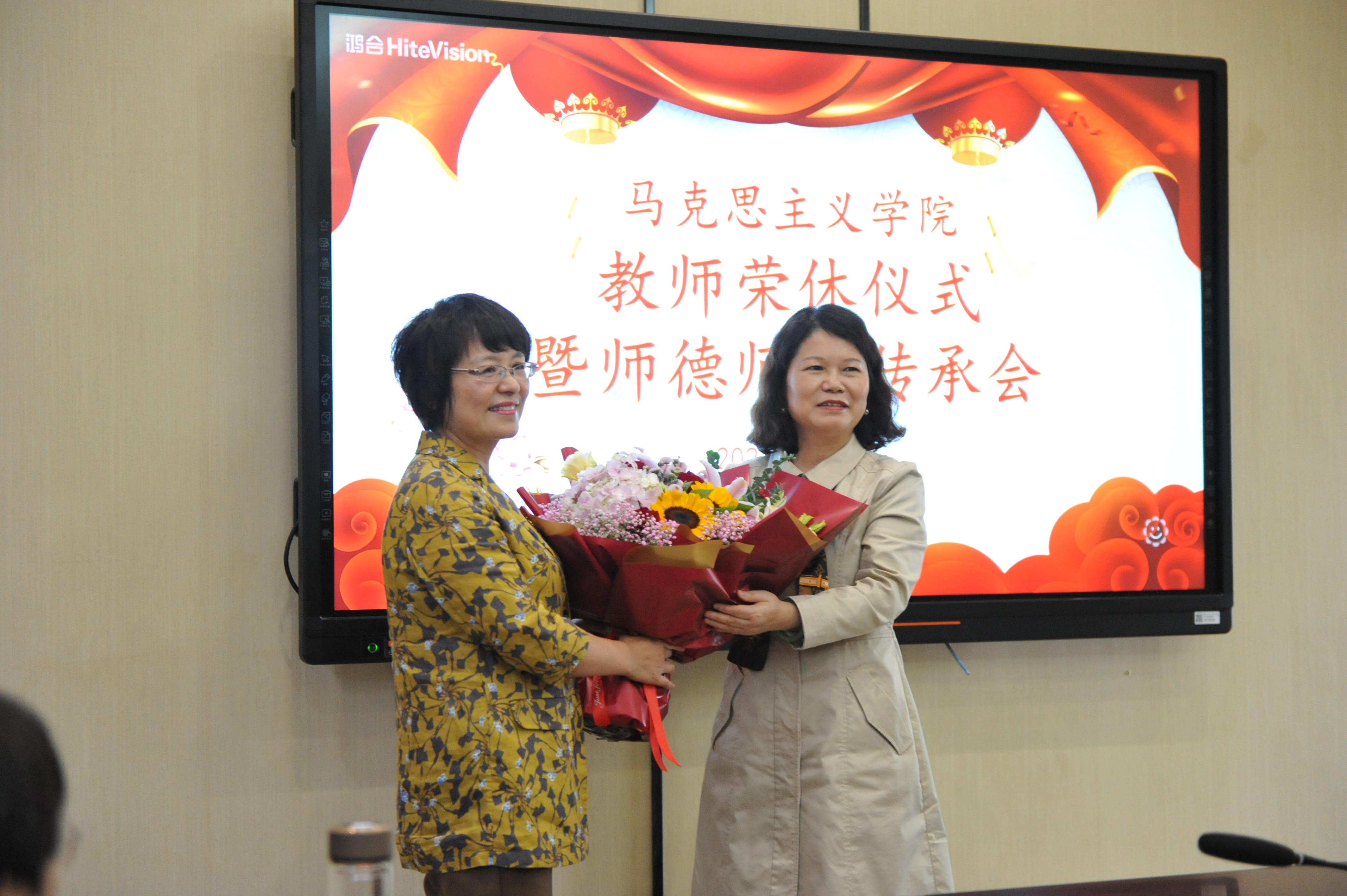 近日,马克思主义学院直属党支部举办了教师荣休仪式暨师德师风传承会。学院用简单而隆重的退休教师荣休仪式,欢送马院第一位退休的潘小妹老师,学院20多名教师共聚一堂,一起感怀岁月,一起传承师道,校工会章韵静主席参加了本次活动。荣休仪式由副院长荣霞主持。