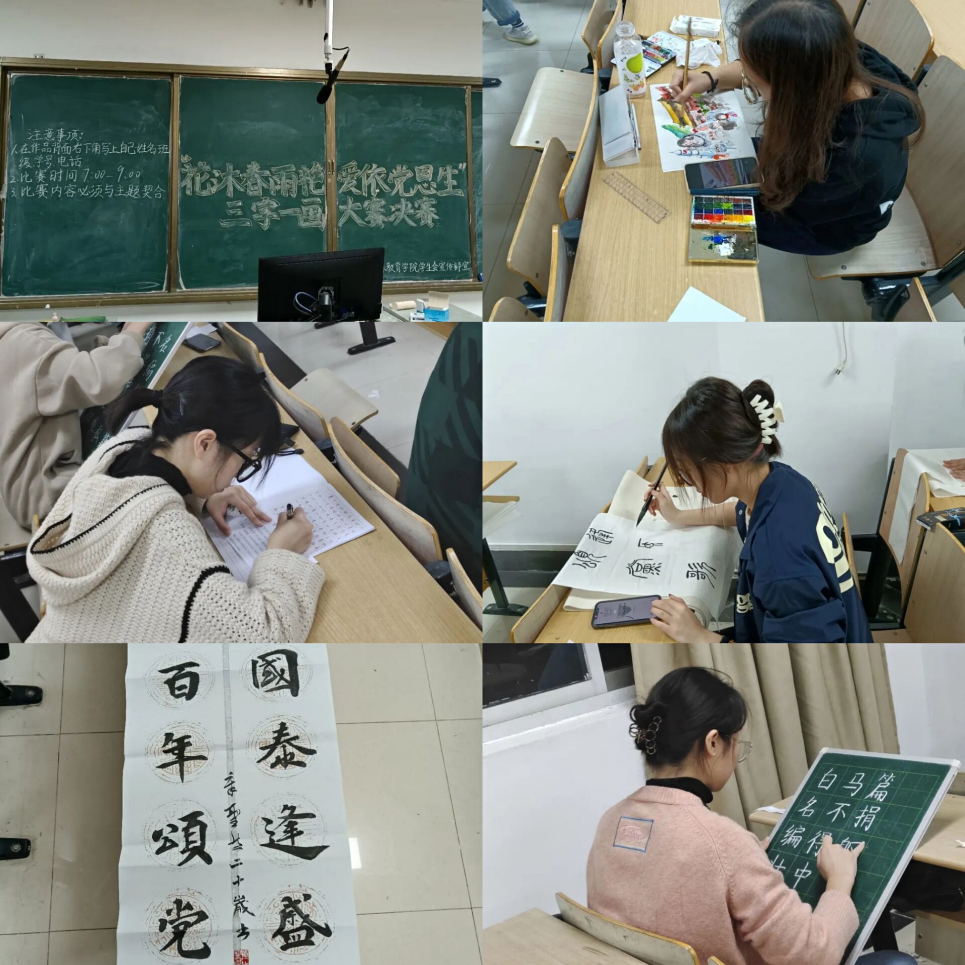 为庆祝中国共产党百年华诞,提升师范生“三字一画”基本技能,特殊教育学院于11举办“花沐春雨艳,爱依党恩生”绘写大赛。绘写大赛分为初赛、复赛、优秀作品展三个环节,包含简笔画、钢笔字、毛笔字、粉笔字四个项目