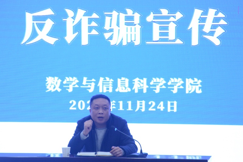 为进一步提高大学生安全防范意识,杜绝校园诈骗情况发生,11月24日下午,数学与信息科学学院召开安全知识系列讲座之反诈骗宣传。本次讲座特邀南京市栖霞区燕子矶派出所姚雪垠警官主讲,学院党总支副书记丁雯、21级辅导员张国盛以及部分21级学生现场共同聆听,讲座由张国盛老师主持。