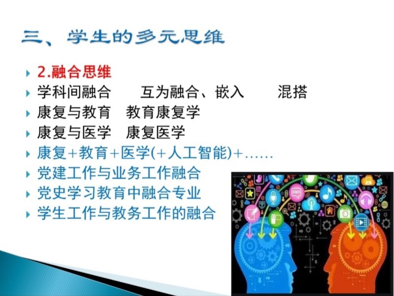 讲座伊始,李鹏副书记以同学们大学四年会遇到的学习与工作、工作与生活、生活与学习三对矛盾引出话题,结合我国全面推进“新工科、新医科、新农科、新文科”建设,尤其是“新文科”建设背景,带领大家思考教育的首要问题,即“培养什么人”。李鹏副书记分享了华南理工大学等国内外知名高校新文科建设的实例,指出单一的思维方式不能适应时代发展需要,面对新情况新问题,要找到新出路,开创新局面,学生必须具备系统思维、融合思维、平台思维、文化思维、健康思维和创新思维等六项思维能力,从多元化的角度思考问题,才能不断提升个人综合素质,成长为复合型、应用型和创新型人才。在新文科的背景下,各学科、各思维模式之间的界限不再泾渭分明,多元思维的培养成为人才培养的重要着力点和落脚点。