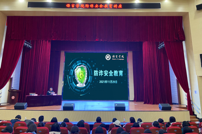 为提升学生的安全防范意识,做好防范电信网络诈骗教育。11月29日晚,语言学院邀请南京市公安局栖霞分局反诈中心负责人潘斗超警官,为同学们做了一场生动的防诈骗专题讲座。讲座由学院党总支副书记谢军主持,学院全体辅导员及2020级、2021级全体学生参加。