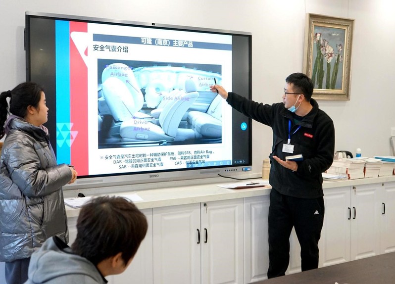徐明敏处长为同学们介绍了可隆集团的起源和发展,并对公司环境、工厂环境、宿舍环境、食堂环境与开设课程等进行了详细的图文介绍,表示欢迎我校毕业生进入公司的安全气囊工厂工作。对于学生提出的疑惑和问题,陈挺处长给予了详实的解答。