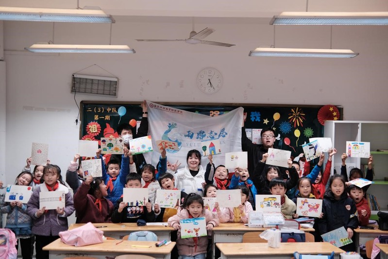 “雨露志愿”团队大学生志愿者分别进入成贤街小学二(3) 、二 (4)班进行授课。本次授课的主题是《树叶拼贴画》与《用彩笔画鱼》,小学生们在课堂上积极发言,勇敢表达自己的想法,并大胆展示自己的作品。