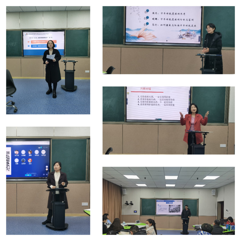 五位老师分别从《马克思主义基本原理》《思想道德与法治》《中国近现代史纲要》三门思政课择取了相关主题进行教学展示,在比赛过程中,五位老师熟练运用智慧教学手段,以教学内容设计与个人讲述为主展现教学水平,围绕选题集中讨论,用循序渐进的教学语言引导主题不断深入,现场气氛也是相当热烈。最后,陈旭老师的激情赛课为比赛画上了圆满的句号。