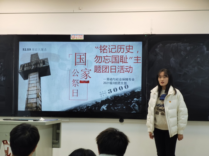 活动开始前,管理学院全体团员为南京大屠杀死难同胞默哀一分钟。管理1903班团支部和2101班团支部书记带领团员观看了南京大屠杀相关历史图片及资料。历史让青年团员们领会“落后就要挨打”的道理,同时也激励着大家铭记苦难历史、珍爱和平、奋发图强、报效祖国。