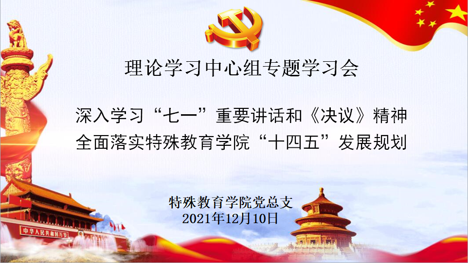 12月10日上午,特殊教育学院党总支召开理论学习中心组专题学习会,深入学习习近平总书记“七一”重要讲话和十九届六中全会《决议》精神,全面落实特殊教育学院“十四五”发展规划。校党委常委、组织部部长张金福出席会议并巡学指导,特殊教育学院全体党总支委员参加会议,会议由党总支书记叶亮主持。
