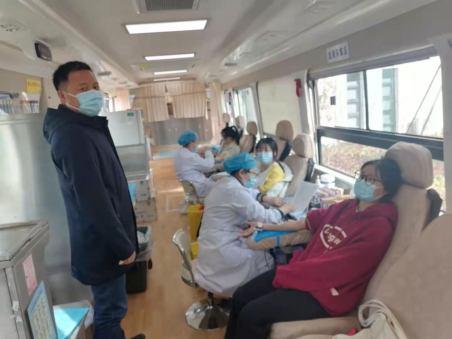 后勤基建处处长陶刚(左一)看望献血的同学。