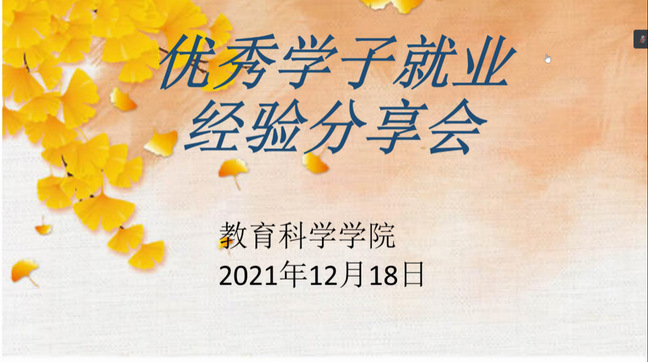 为让同学们进一步了解就业以及面试的相关信息,消除同学们对于就业的种种困惑。教育科学学院于12月18日举办线上就业经验分享会,邀请21届优秀毕业生和考编成功的22届同学进行分享,该院辅导员江敏和18级全体学生参加。
