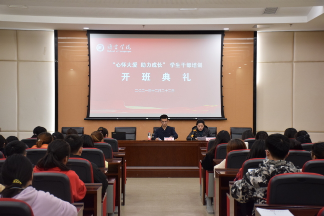 为进一步加强学生干部队伍建设,增强学生骨干的思想素质,不断提高学生干部为学院师生服务的意识和能力。12月22日下午,语言学院举办“心怀大爱 助力成长”学生干部培训开班典礼。学院党总支副书记谢军、全体辅导员以及全体学生干部参加。典礼由团总支书记(学工办主任)郑丹丹主持。
