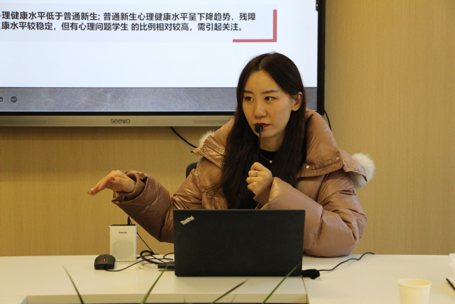严茹老师以团体心理辅导游戏开场,帮助师生迅速熟悉、建立联系的同时,为各心理委员在工作中如何通过丰富的团体活动建立起相互信任、和睦融洽的同学关系。随后,严茹老师在为大家做了题为“融合教育背景下大学生心理健康教育”的专题辅导。她以数据分析、案例讲解等形式,从心理健康的动态过程性、心理问题的普遍性、心理问题的诱因、心理问题的分类及表现、心理问题的应对方法等几个方面阐述了大学生怎样应对心理问题,详细介绍了线上预约学校心理咨询、现场预约咨询、江苏省大学生24小时心理热线、苏心APP——“我在 你说”等心理咨询方式,指出心理委员应积极宣传心理健康知识,及时关注班级每一位同学,遇到问题早发现、早报告、早转介,主动为班级同学做好心理健康服务。