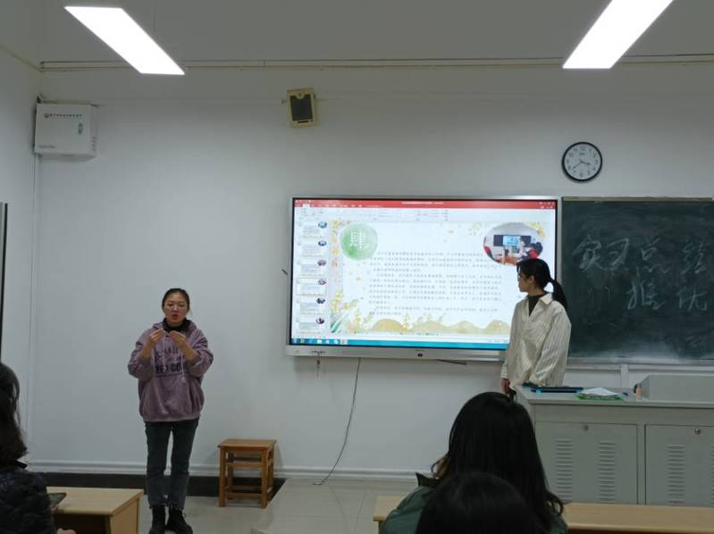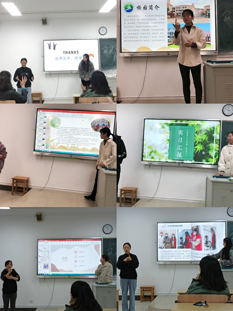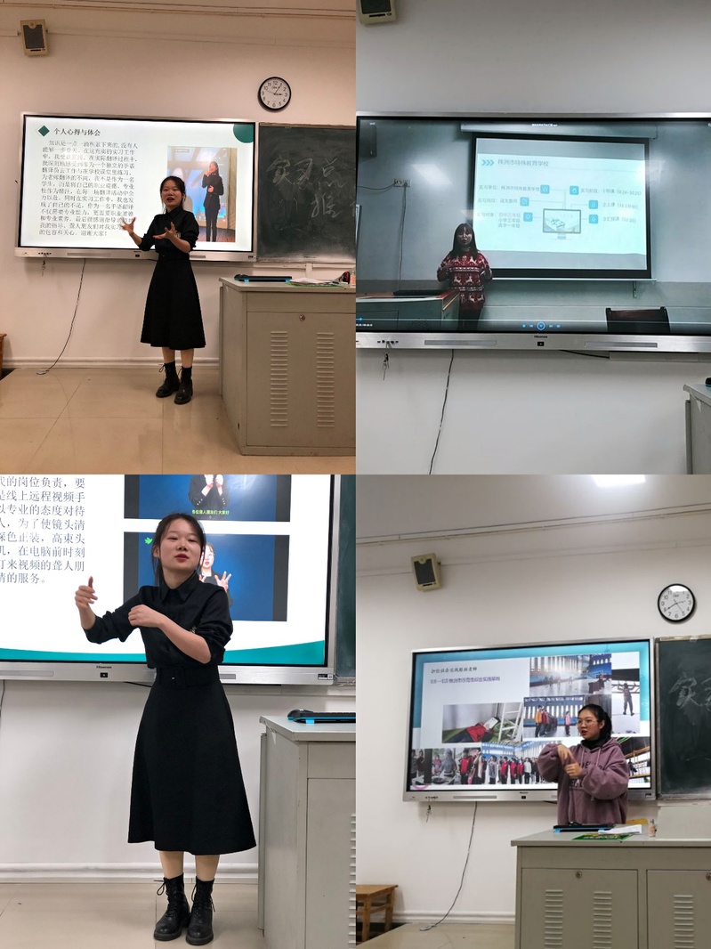 活动的第二项内容是三名实习生的个人精彩汇报。第一名同学从教学和翻译两方面汇报自己的实习工作,介绍自己的工作情况以及遇到的困难及解决过程,最后还和大家分享自己的收获体会。第二名同学在实习期间,去过学校做翻译,也曾前往医院帮助聋人就医,即使受疫情影响也可以通过线上平台帮助聋人进行社会交流。还分享了在手语翻译实践过程中应该注意的细节,丰富的实习经历让同学们感叹。第三名同学,因受邀留在实习学校担任代课老师,她专门拍摄了一段视频进行实习汇报,交流自己的实习经历与所思所想。