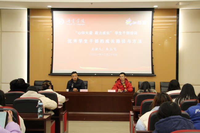 为进一步提升学生干部的综合素质,树立远大的理想,增强自我教育、自我管理、自我服务的意识。12月27日晚,语言学院邀请学生工作处副处长朱玉飞作了题为“优秀学生干部的成长路径与方法”的专题讲座,学院全体辅导员、全体学生干部参加。讲座由学院党总支副书记谢军主持。