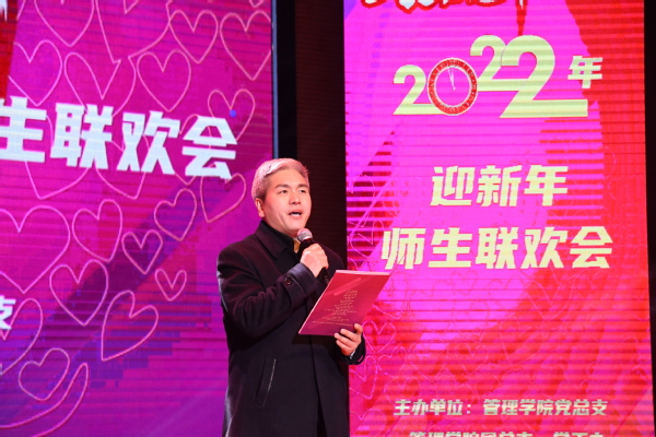 迎新年联欢会伊始,杨会良院长致辞,首先,他向刻苦求学、锐意进取的全体同学,认真负责、勤勉工作的全体教职工,一直以来关心支持学院发展的各位领导、各界朋友,致以最衷心的感谢和最诚挚的新年问候,并简要总结了管理学院2021年工作。他表示,2021年,是不平凡的一年,中国共产党成立一百周年,“十四五”开局之年,也是贯彻十九届五中、六中全会的落实之年,更是管理学院发展值得铭记的一年。一是学科专业建设实现新突破;二是人才和师资队伍建设成效显著;三是育人质量不断提升。2022年也将是重要的时间节点,这一年,中国共产党第二十次全国代表大会将要胜利召开,我校也将迎来四十年华诞,回顾过去,展望未来,学院将秉持“公共精神、博爱情怀、禀道毓德、厚学强术”办院理念,遵循“入主流、强特色、促融合、创一流”的指导思想,秣马厉兵,砥砺前行,做优残疾人事业管理人才培养,为建设国内一流、国际有影响的特殊教育师范本科院校书写管理学院奋进之笔,谱写浓抹重彩之华章,以优异的成绩,向党的二十大献礼!