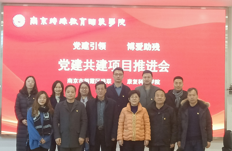 为深入贯彻落实十九届六中全会精神,探索新形势下基层党组织建设新模式,实现博爱助残的美好愿景,2021年12月30日,康复科学学院与南京市栖霞区残疾人联合会(以下简称“栖霞区残联”)党建共建合作项目促进会在校召开。栖霞区残联黄伟理事长、王燕江副理事长一行六人,校党委常委姜玉泉副校长、组织部张金福部长、康复科学学院王姣艳副院长、美术与设计学院薛皓洁副书记以及康复科学学院党员教师代表出席此次会议。会议由康复科学学院党总支副书记吴填主持。