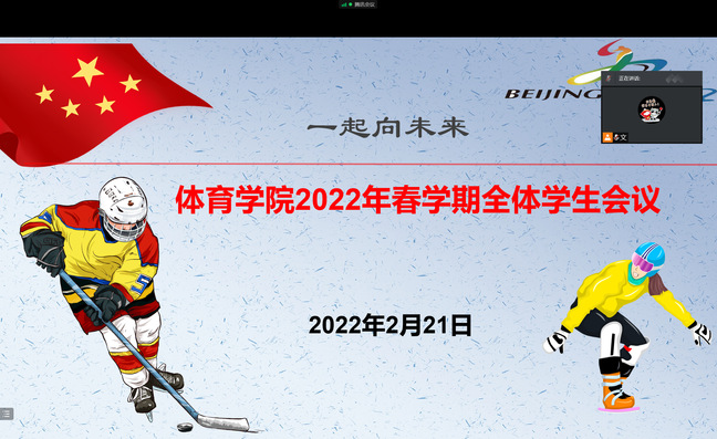 腊尽春至,壬寅岁连,当虎年碰上冬奥,当斗志融入拼搏,立于新的起点,怀着憧憬与期待,2022年2月21日晚,体育学院举办2022年春学期全体学生会议暨“开学第一课”。体育学院直属党支部书记张启昕、体育学院副院长金梅、副院长仝伟与辅导员、班主任参会。会议由体育学院团总支副书记屈文文主持。