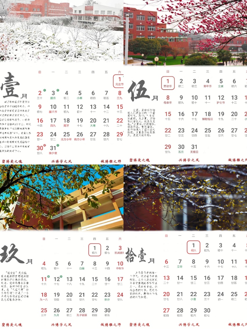 “春雨惊春清谷天,夏满芒夏暑相连”。二十四节气是我国古代劳动人民的智慧结晶,当经典诗文与传统节气相互碰撞,“扔下农具即是诗行”的中华传统文化之美便倾泻而出。农耕时代虽已过去,但“二十四节气”却如春雨般浸润着人民生活,也滋养着我们的精神世界。同学们用节气与南京特师校园景色相互融合,串起大学的美好记忆,用新春台历的文创形式捕捉每个节气背后的校园故事。该创意活动充分展现了同学们的创造性与文化传承的自觉性。