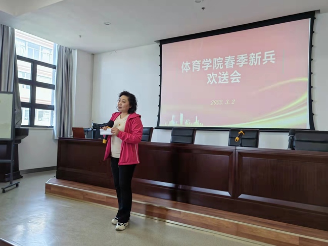 一段祝福视频拉开了序幕。紧接着,张书记代表体育学院向预定入伍新兵表示祝贺,对他们从军报国的志向和激情予以肯定,她指出,我院2名学生响应祖国召唤参军入伍,暂别校园投身军营,把爱国之心化为报国之行,是体育学子磨砺青春、激扬青春的重要体现,也是不负时代重托、青春向党的有力证明,为广大同学树立了榜样。她寄语入伍新兵努力适应部队生活,遵守部队纪律,以钢铁战士般的行动,以自强不息、勇于攀登的精神,在实现强军梦的伟大实践中,书写绚烂、无悔的青春篇章,做一名听党指挥、能打胜仗、作风优良的新时期“四有”军人。