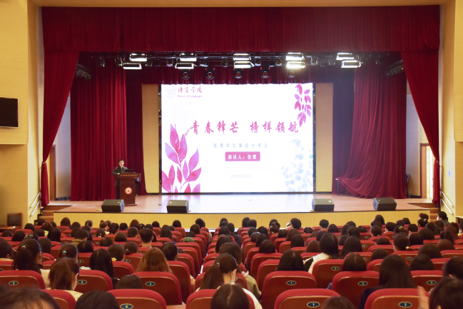 3月9日下午,语言学院举行了第一场“青春锋芒 榜样领航”优秀学生事迹分享会。学院执行院长王东、学院全体辅导员、2020级与2021级学生300余人参加。分享会由语言学院“国家奖学金”获得者、汉语言文学专业2018级的张熠同学主讲,学院党总支副书记谢军主持。