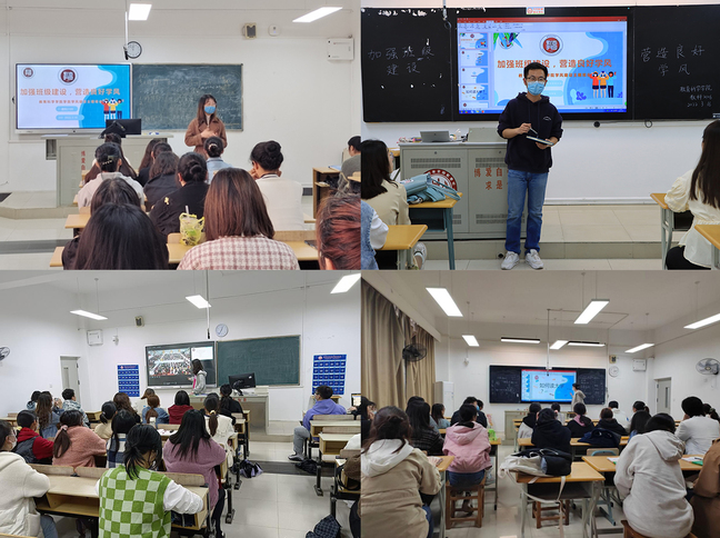 为了深入贯彻落实《中共中央国务院关于加强和改进新形势下高校思想政治工作的意见》《南京特殊教育师范学院进一步加强和改进学风建设的实施方案》等文件精神,激励同学们在学习生活中丰富知识体系、掌握知识技能,形成良好的学习氛围,进一步推进学风建设,教育科学学院各班级于2022年3月举行学风建设主题班会。各班辅导员、班主任老师出席,教育科学学院全体学生参加。