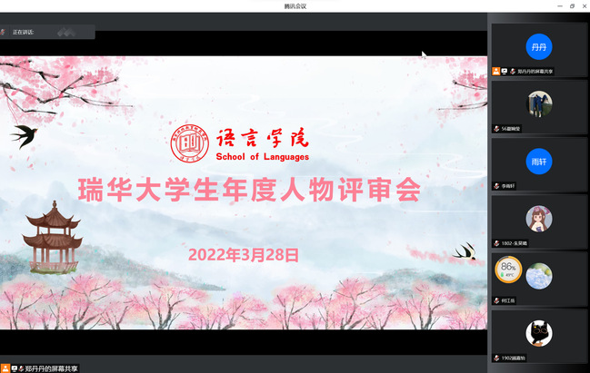 为展现学生积极进取的良好风貌,营造比、学、赶、超的优良学风。3月28日晚,语言学院在线上举办2022年“瑞华大学生年度人物”院内评选展示活动。活动由学工办主任郑丹丹主持,学院有关负责人及全体辅导员担任评委。