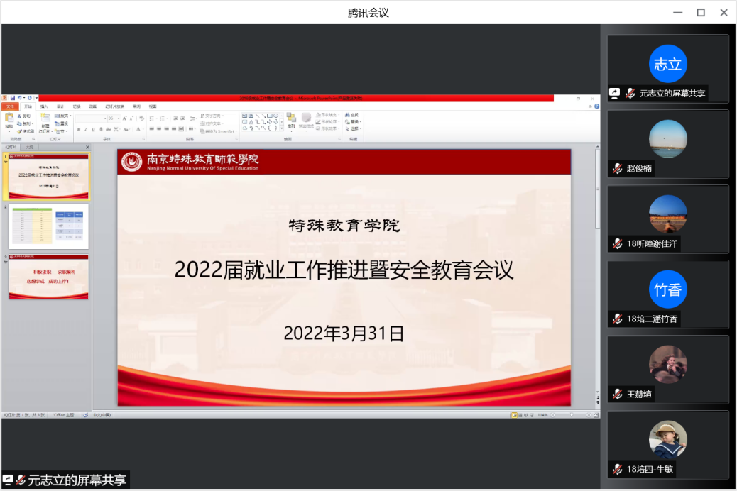 为进一步了解当前就业形势政策,促进疫情期间顺利开展毕业班就业工作,特殊教育学院于3月31日晚在线召开2022届就业工作推进暨安全教育会议。学院党总支书记叶亮、党总支副书记李鹏、毕业班辅导员、毕业班班主任和全体2018级学生参加,学生工作处郭建勇老师和娄文婧老师参会做专题辅导。会议由学工办副主任元志立老师主持。