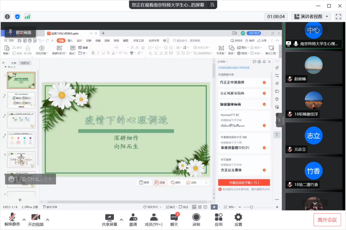针对当前疫情期间线上上课的情况,学工处娄文婧老师为大家带来以“深耕细作,向阳而生”为主题的心理调适辅导讲座,她提到针对疫情引发的焦虑不适要有平和的心态,反观疫情下的独特体验要学会接纳。面对就业困难时应不忘初心、保持耐心,相信适合自己的工作就在前方。